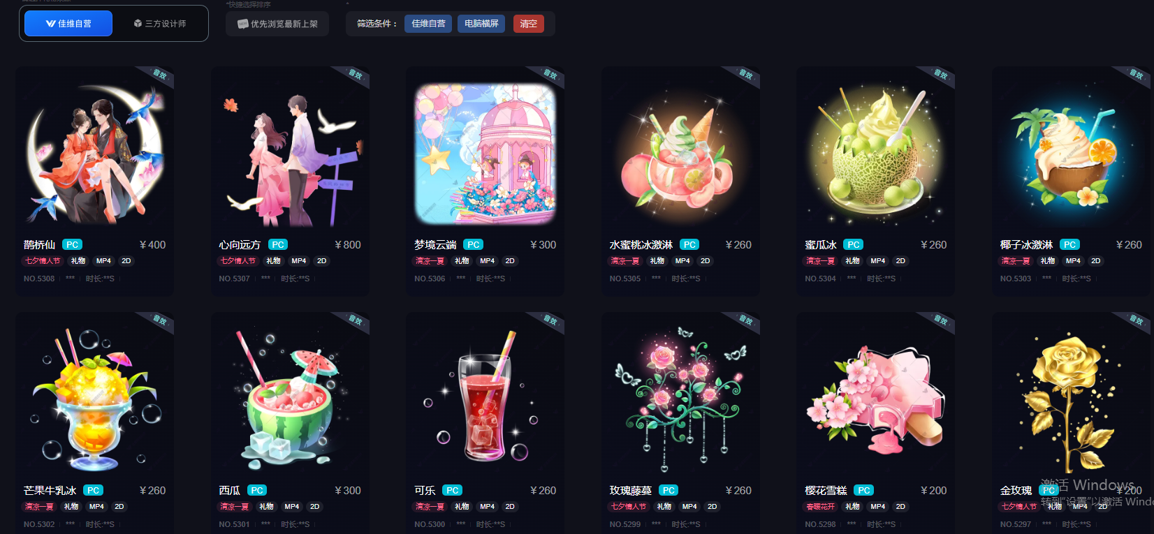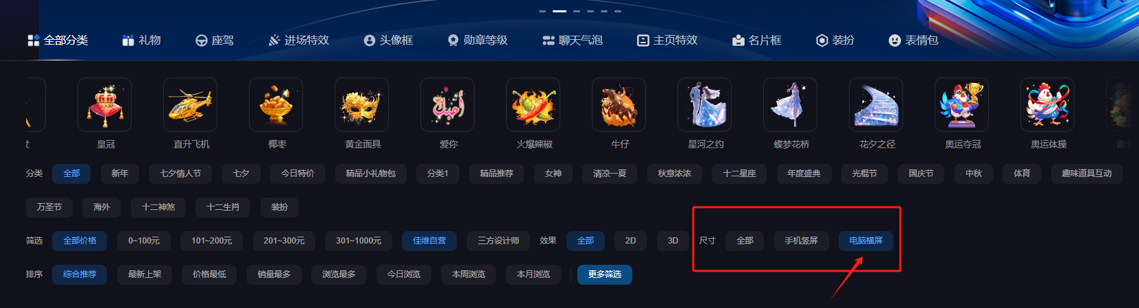第一步:打开礼物商城,选择礼物尺寸类型。可根据平台需求挑选手机竖屏尺寸或电脑横屏尺寸。
