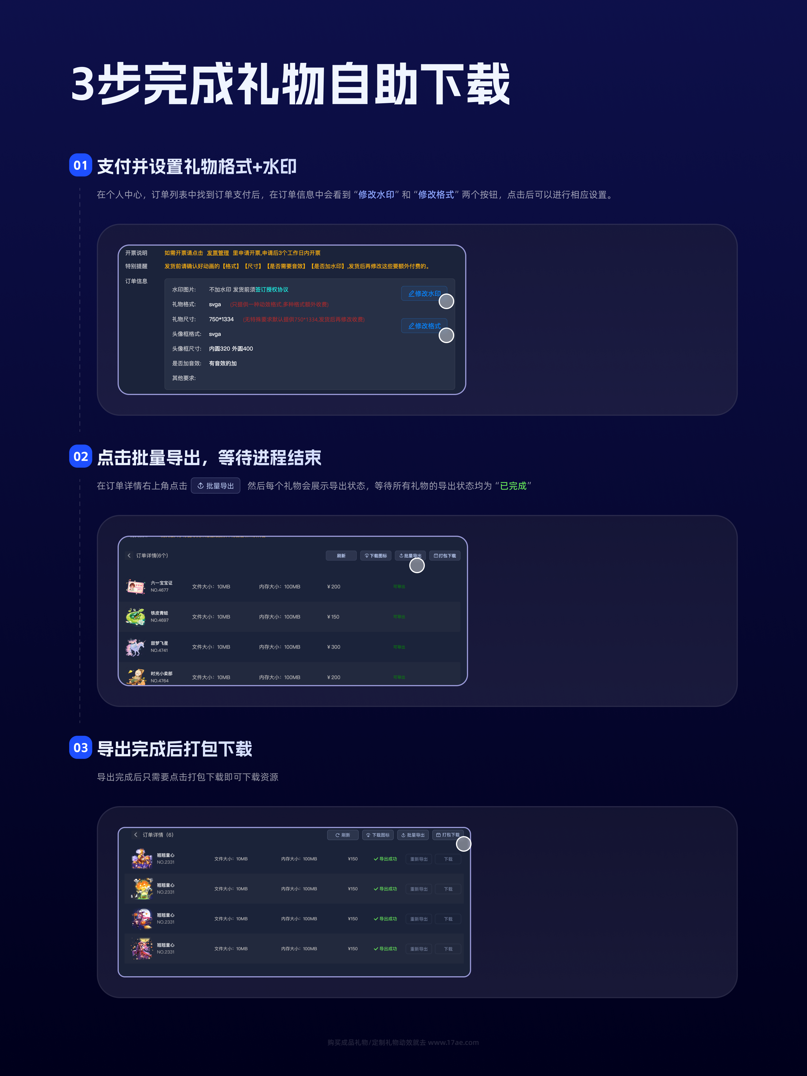 我们实现了从“自助下单”到“自动发货”,再到“自助下载导出”的全链条自助化服务。用户无需繁琐沟通,自助设置礼物所需的格式尺和水印寸后,显示可自动发货即可自助下载导出,轻松几步即可轻松完成购买流程,极大地提升了便捷性和灵活性。